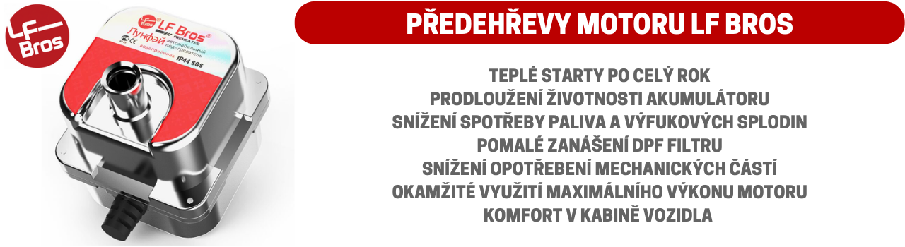 Předehřívače motorů na střídavý elektrický proud o napětí 230V zajistí teplé starty Vašeho vozidla po celý rok. Nejen, že tak snížíte opotřebení mechanických částí agregátu, ale i spotřebu vozidla a zanášení filtru pevných částic. Předehřívače motorů splňují krytí IP44, které umožňuje montáž prakticky kdekoli v motorové části vozu. Výrobce LF Bros tento produkt dodává od roku 2003. Za tu dobu byl několikrát inovován, na základě zkušeností z dlouhodobého provozu. Nyní se může pochlubit efektivní výhřevností a spolehlivostí i v nejnáročnějších podmínkách. Předehřevy motoru jsou velmi žádané například v severských zemích, kde jsou teploty dlouhodobě hluboko pod bodem mrazu.